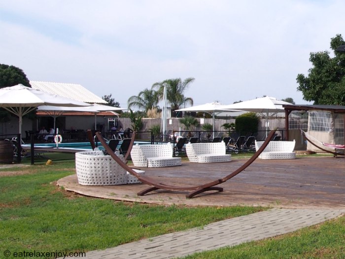 בחצר רחבת הידיים פזורים ערסלים וכסאות נוח בשפע המאפשרים בילוי