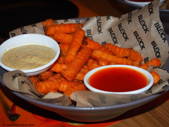 כל הפתיחים שהוזמנו הוגשו עם צ'ילי מתוק ורוטב טרטר הייחודי של בלאק לפי המתכון של צחי בוקששתר שהוא פשוט נהדר, הוא משתלב נהדר עם כל הפתיחים אבל לדעתי השילוב שלו עם צ'יפס הבטטה המתקתק פשוט מעולה!
