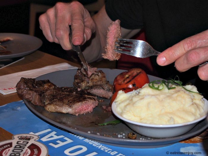 סטייק אנטריטוק מיושן עם פירה חלבי. אנטריקוט גדול ועסיסי עשוי בדיוק לפי הבקשה (מדיום) - בתמונה רואים את הורדרדות, עם פירה נהדר.
