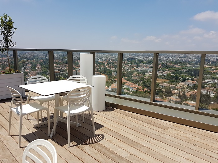 ומרשים עד לים ותצפית נהדרת על כל המטרופולין עד תל אביב. בטרקלין כיבוד קל, קפה
