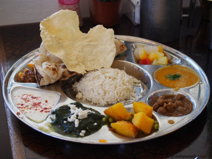 הכיל מלפפון, עגבניה, פלפל ירוק, כרוב לבן, חסה ובצל חתוכים גס. תבשיל התרד (פלאק פאניר) והגבינה מאוד עדינים וקצת הלכו לאיבוד בשלל הטעמים של התבשילים האחרים. הסתפקתי בסלט הפירות