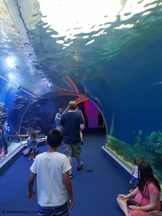 דרך מסדרון שקוף שחוצים אותו תחת המים. זוהי תצפית בלתי אמצעית על כל הדגה, כולל כרישים,