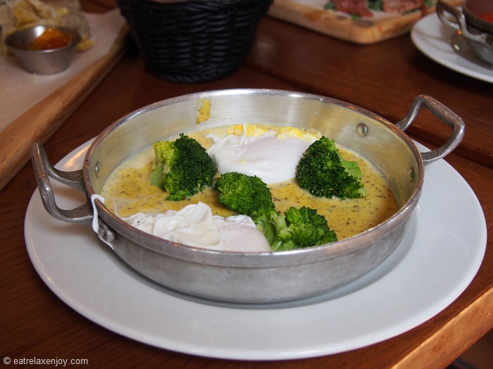 כמהין בייצים עלומות וברוקולי. פלטת פתיחים: גבינת גורונזולה, ריקוטה, פטה כבד,