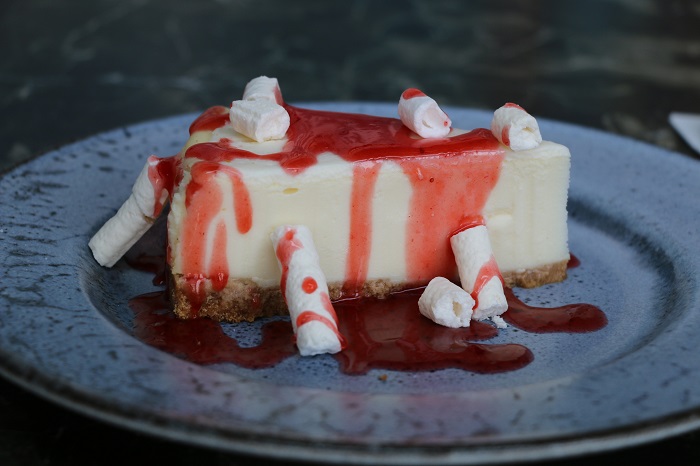 עוגת גבינה אפויה המוגשת עם מקלות מרנג וקולי תותים טריים 45. מתאימה כמו כפפה לסיום הארוחה, קלה, לא מתוקה מדי והקולי מתוק חמצמץ משתלב היטב.